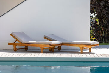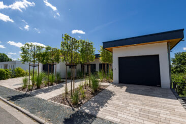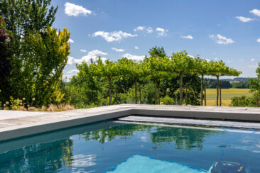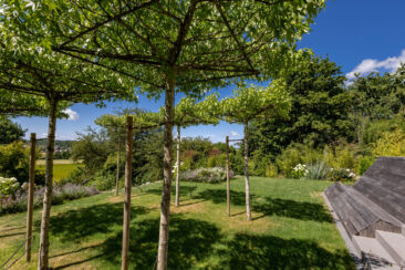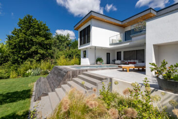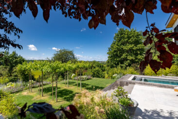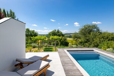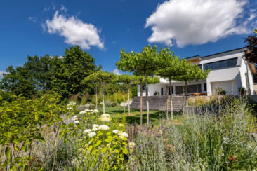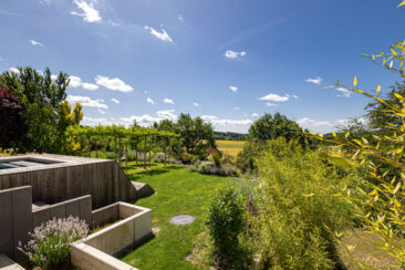 Um den weit zurückliegenden Eingang nicht in den Hintergrund rücken zu lassen, wurde er durch eine kleine Alle aus Spalierbäumen ins Zentrum gerückt. Der Weg zieht einen nun zur Tür, die einladend und offen erscheint. Im hinteren Garten besticht der Pool durch seine Aussicht. An seinem Ende befindet sich eine Ebene tiefer eine fast 5 Meter lange Relaxbank, aus der man gar nicht mehr aufstehen möchte. Die Dachbäume bieten an heißen Sommertagen einen kühlen Rückzugsort mit einem Sitzplatz zum Essen und Erholen. Der weite Blick wird über eine weiche Staudenpflanzung gelenkt, in der immer etwas blüht. Wer möchte da nicht gerne die Seele baumeln lassen…