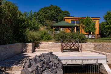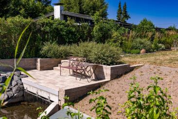 Heute führen unterschiedliche Treppenebenen zum Wasser. Das Kanalrohr wurde in einen Sitzplatz direkt am Wasser verwandelt. Eine rückseitige Steinmauer mit Weiden schafft Intimität. Sowohl für den Besucher des Platzes als auch für die Sichtachsen der Bewohner